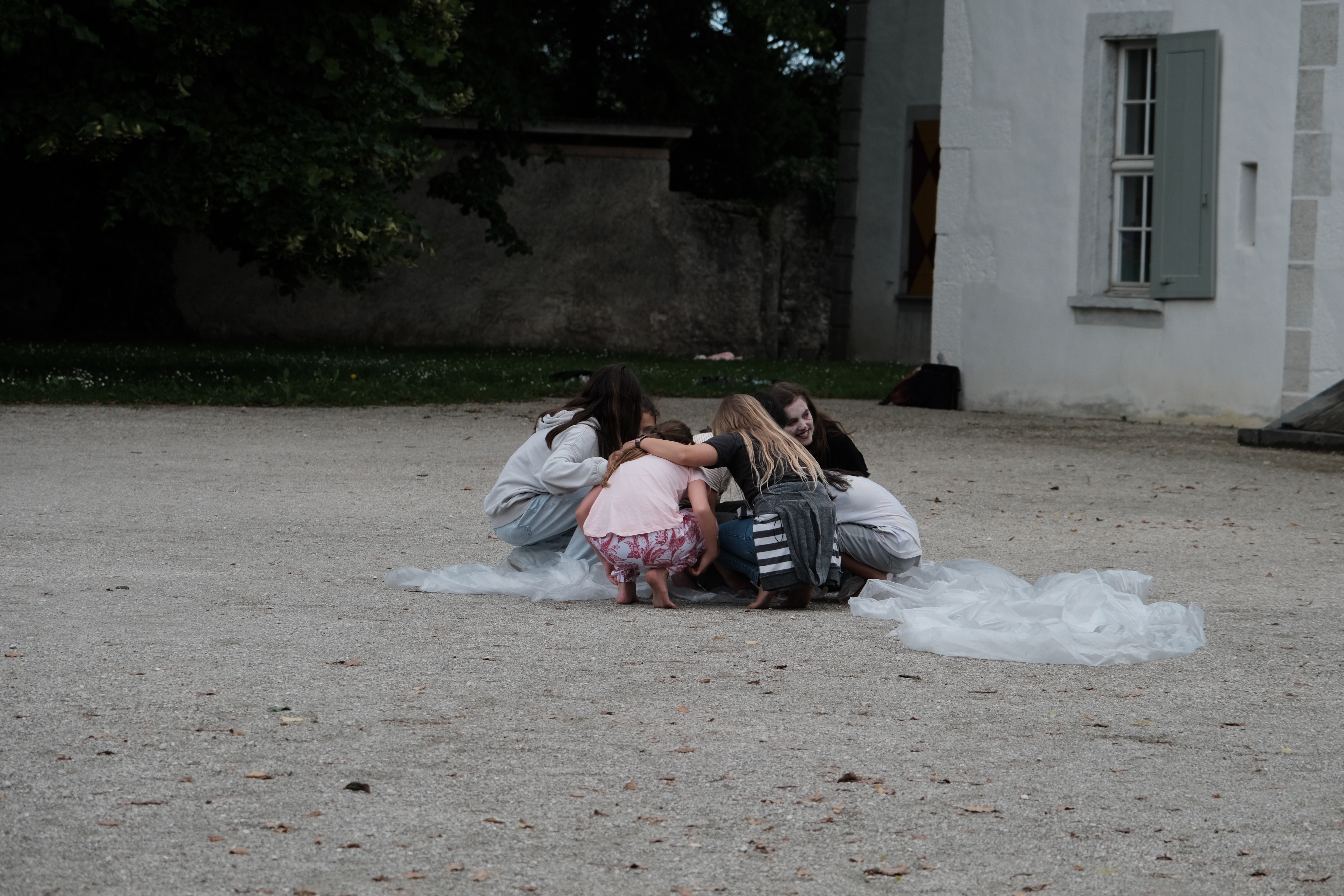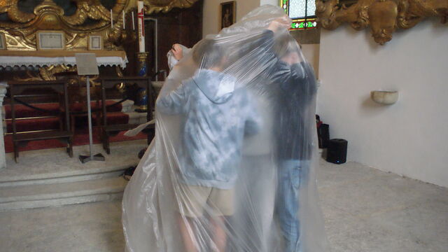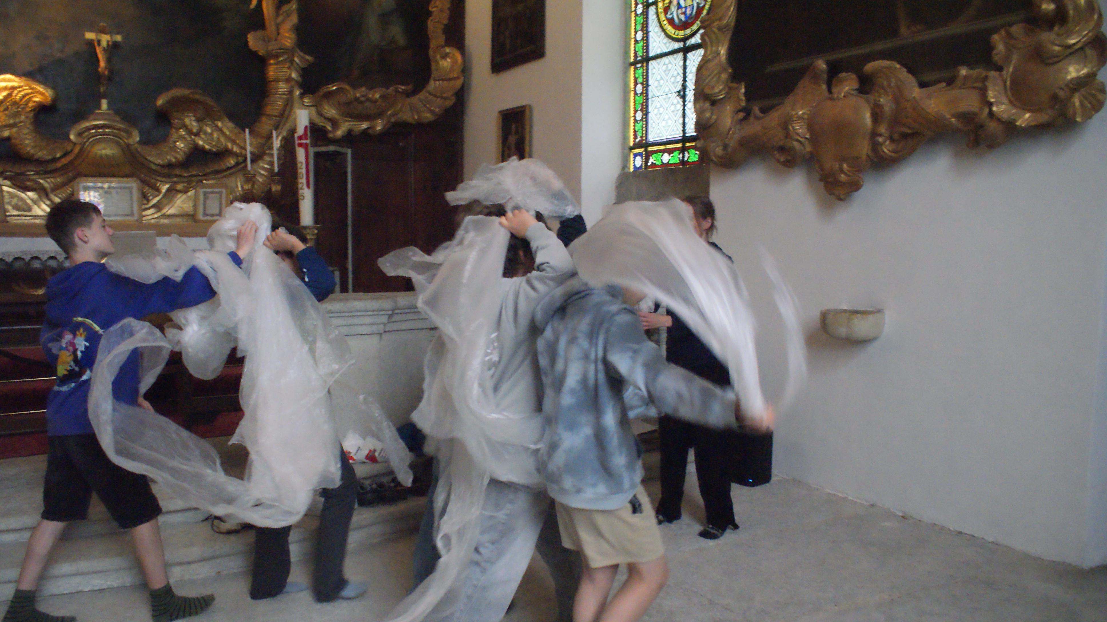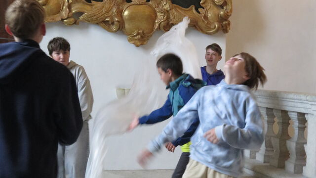 Material und Körper. So lautete das Thema des heutigen Ateliers «Figurentheater» für eine Schulklasse. Dieses fand in der Kapelle des Schloss Waldeggs statt und wurde geleitet durch Mirjam Ellenbroek. Zu Beginn wurde ein Kreis gebildet. Mit einer umhergehenden Klatschbewegung durfte sich jeder kurz mit seinem Namen vorstellen. Danach folgte eine Lockerungsübung. Anschliessend fanden sich alle in einem Sitzkreis ein. Nach einer kurzen Dehneinheit begann das eigentliche Programm. Zu langsamer Klaviermusik begann sich jeder für sich zu bewegen.