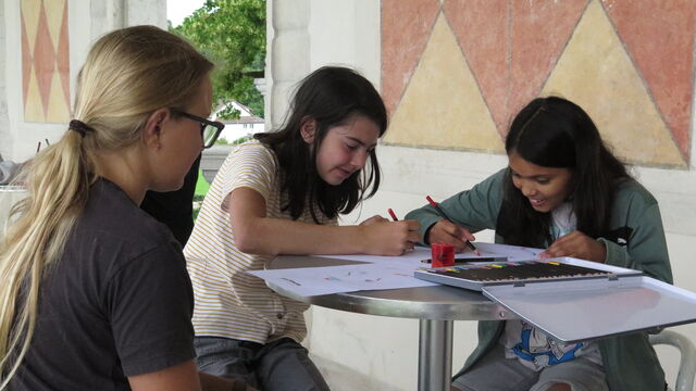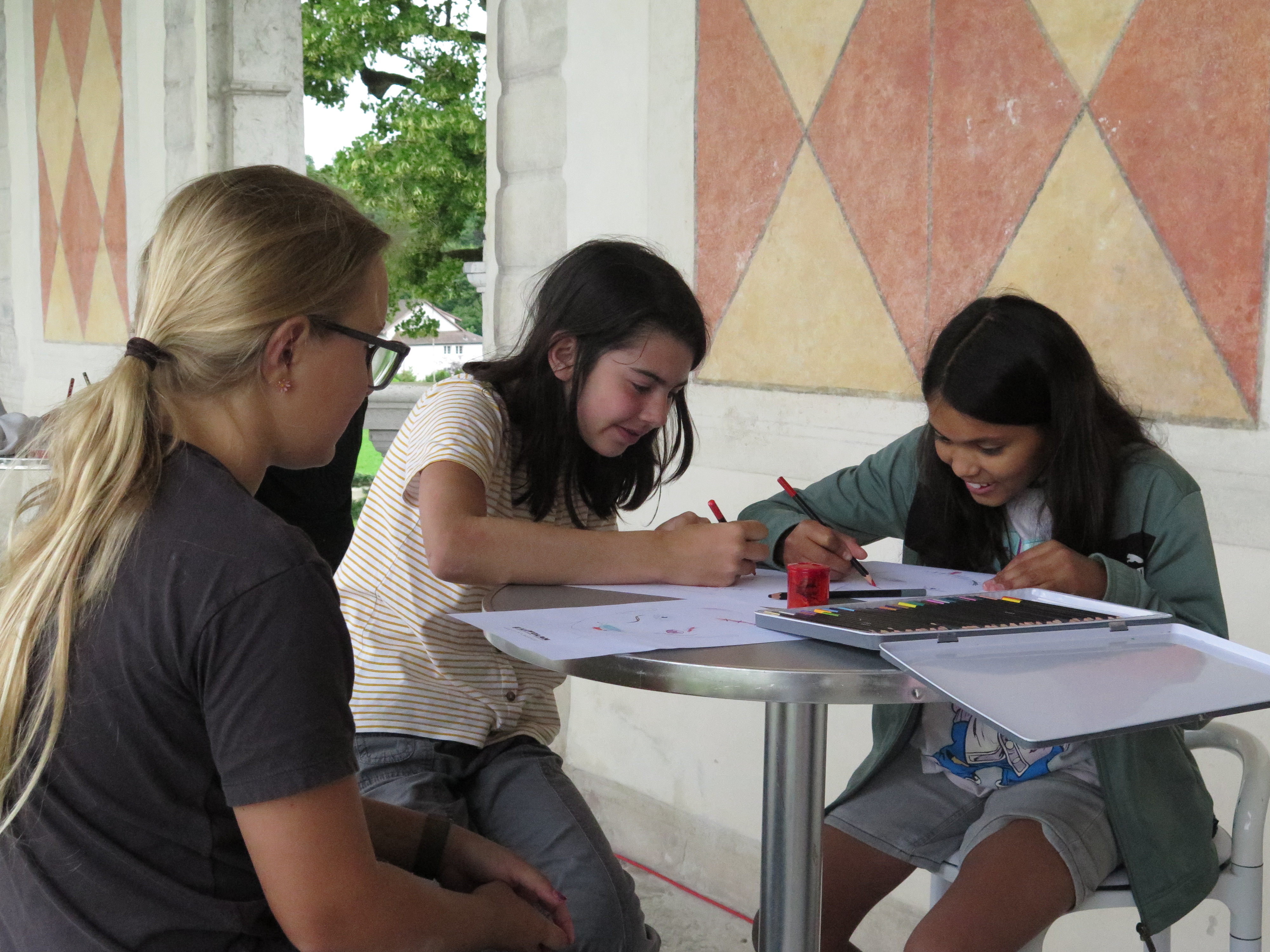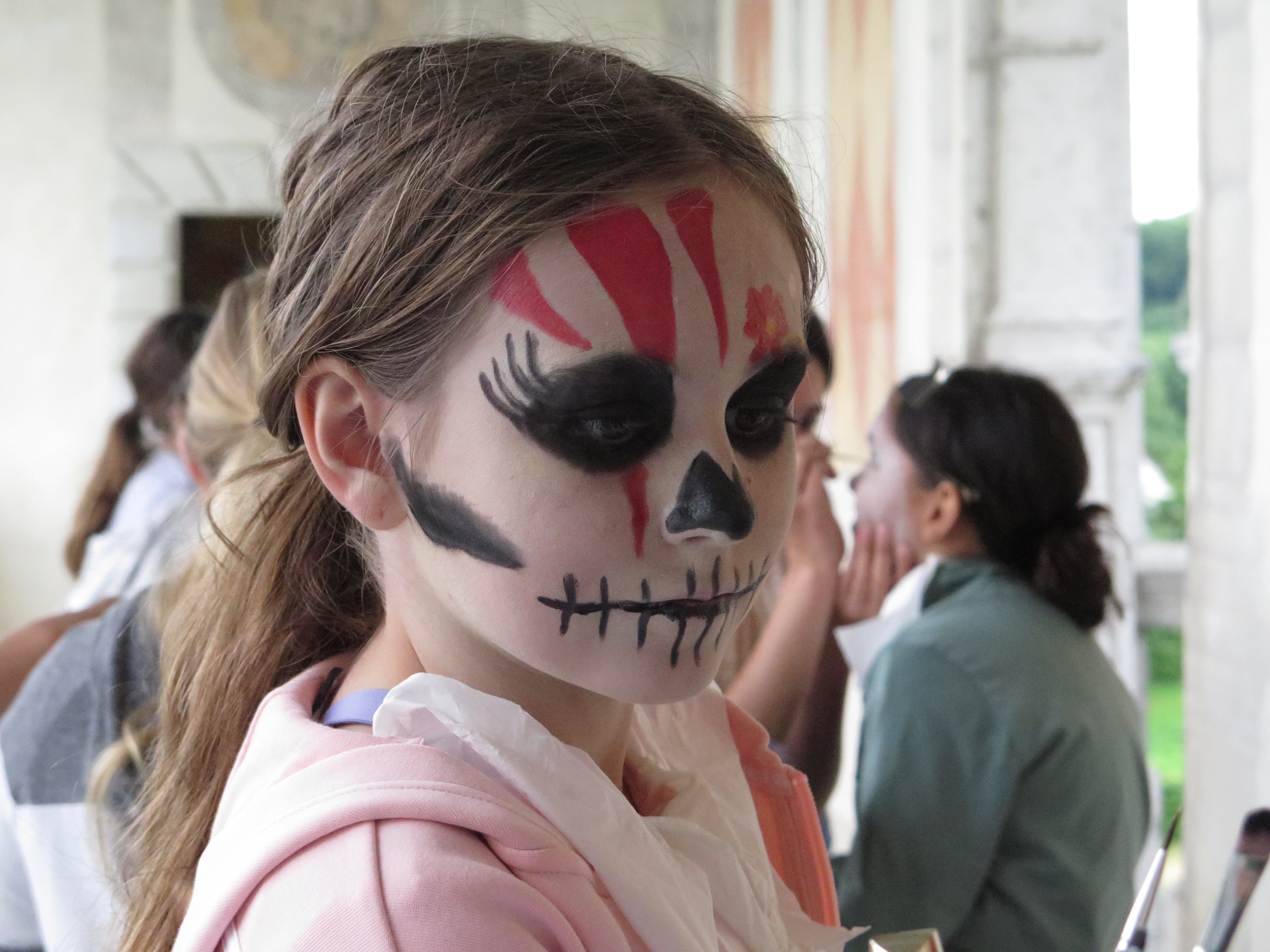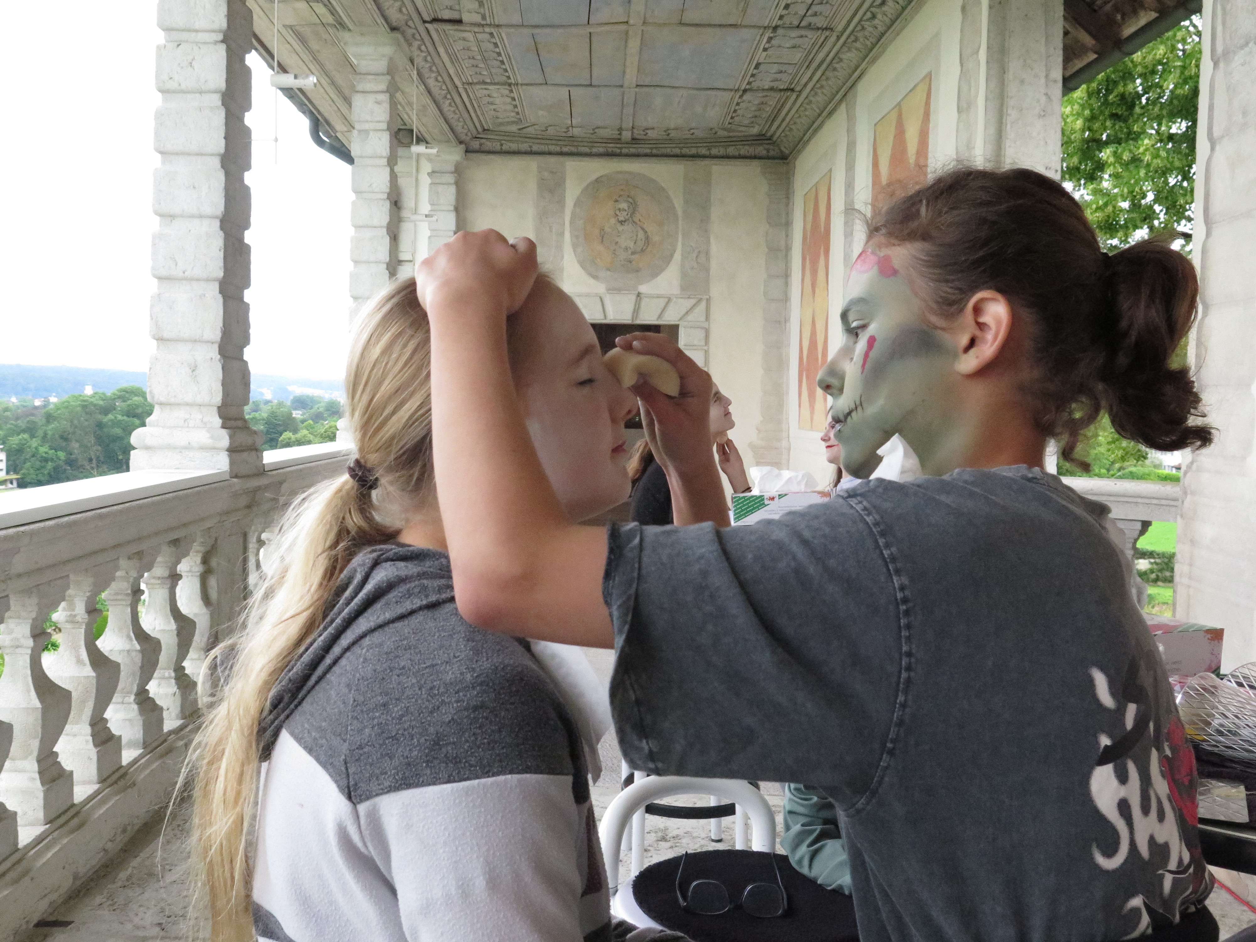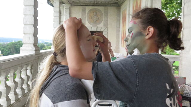 Freitagmorgen: Sieben Mädchen kommen auf dem Balkon des Schlosses, um sich bei diesem Atelier als Monster schminken zu lassen. Das von ihnen ausgewählte Thema ist «gruselige Monster».