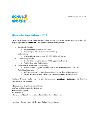 Wie macht man eigentlich ein Festival? Unser Angebot für Projektklassen ist für neugierige, begeisterte Macher:innen, die gerne anpacken wollen. Wir bieten ihnen deswegen in vielfältigen Bereichen die Möglichkeit, die Schultheaterwoche mit einem Projekt mitzugestalten. Dazu planen wir gemeinsam euer Projekt, anschliessend bereitet ihr als Lehrperson in einem Teil der Unterrichtszeit (bspw. BG, TG, EESA, WAH) das Projekt vor und seid mit eurer Klasse in der Umsetzung an mehreren Tagen an der Schultheaterwoche im Juni 2026 mit dabei. Unterstützt und begleitet werdet ihr ebenfalls – bei Bedarf – von eine:r Theater- oder Kulturschaffende:n.