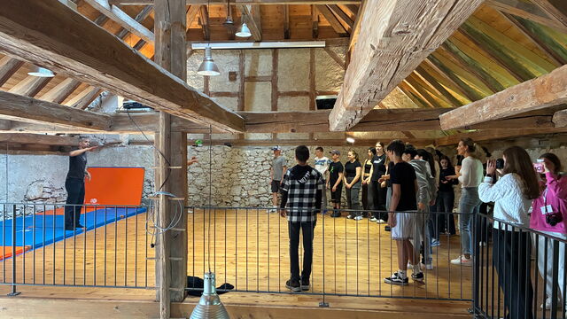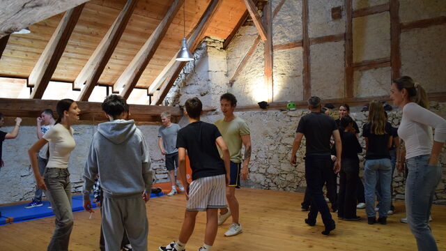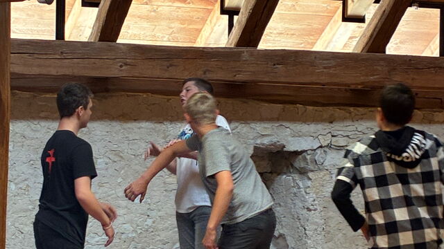Ein kurzer Aufschrei. Zwei Körper wirbeln durcheinander. Ein Schüler stürzt dramatisch auf den Boden und steht danach lachend wieder auf. Was wie ein echter Streit aussieht, ist in Wahrheit genau geplant. Im Bühnenkampf-Atelier auf Schloss Waldegg wird Theater zu Action.