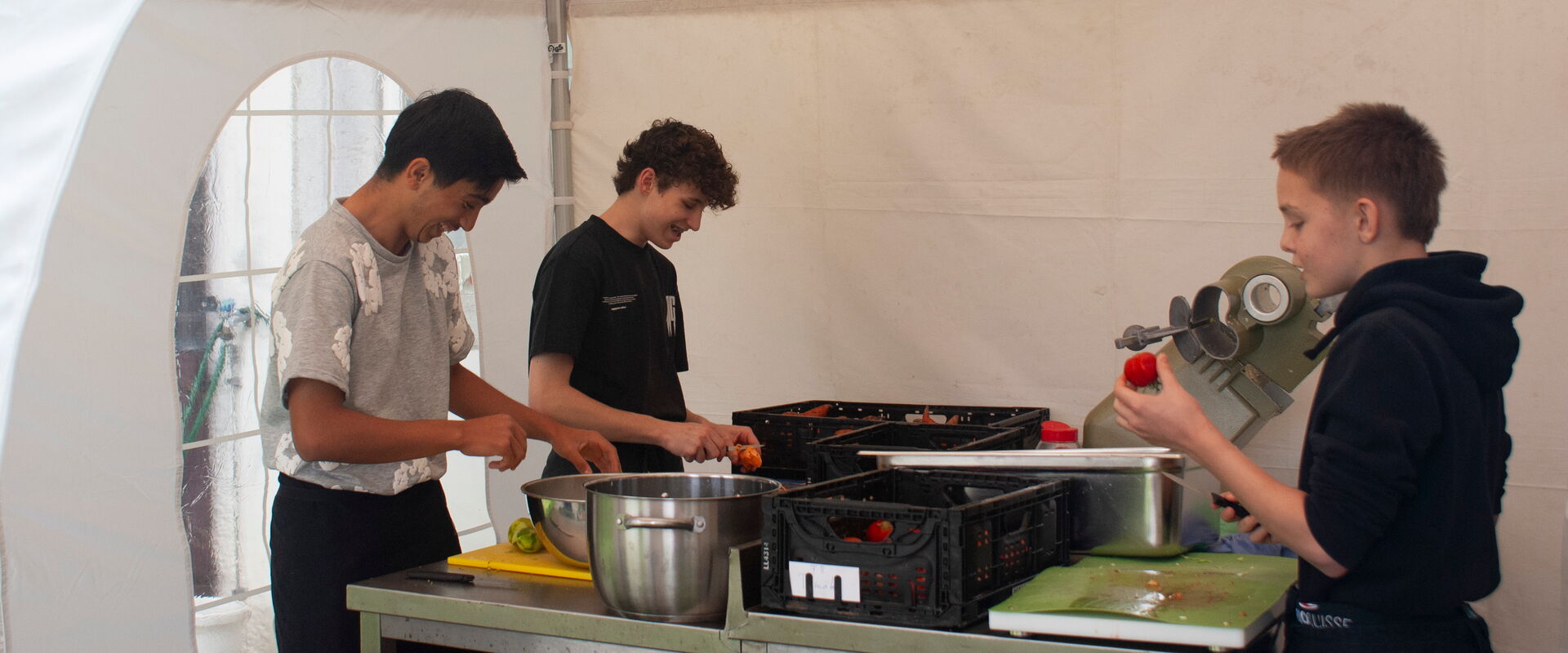 «Ich hab noch nie für so viele gekocht», erzählt einer der Jungs und lacht nervös. Doch je länger sie arbeiten, desto besser läuft es. Jeder findet seinen Platz: schneiden, rühren, würzen, anrichten – alles im Team. Die Küche war zwar eng, aber die Stimmung locker. Es wird konzentriert gearbeitet, aber auch viel gelacht. Man merkt: Die vier nehmen ihre Aufgabe ernst, haben aber auch Spass dabei.