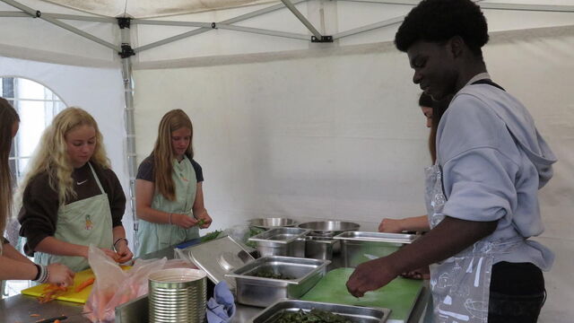 Dampf in der Küche, konzentrierte Gesichter, viel Bewegung. Im Koch-Atelier auf Schloss Waldegg bereiteten Schülerinnen und Schüler zusammen mit dem Koch Pablo Bobrik das Mittagessen für alle vor. Als Ralf Harder ins Mikrofon rief: «Das Essen ist bereit!», strömten die Gruppen herbei.