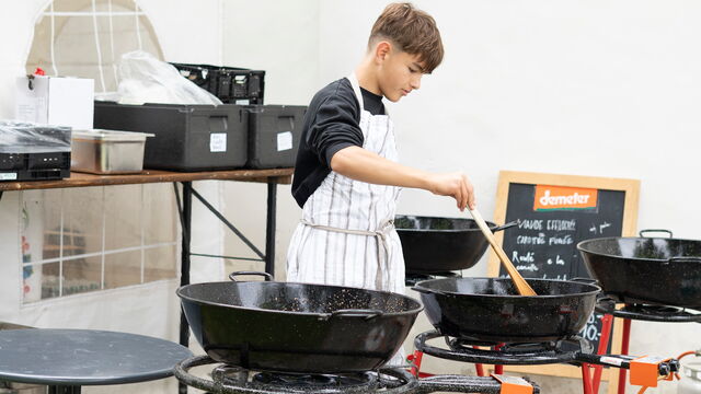 Der Herd läuft, Messer schneiden, Töpfe klappern – in der Schlossküche herrscht Hochbetrieb. Im Atelier Küche geht es zur Sache: Vier Jungs bereiten gemeinsam mit dem Koch Pablo Bobrik das Mittagessen für alle zu. Kein einfaches Unterfangen: Den Jungs war nicht ganz klar, wie viele hungrige Gäste sie erwarten. Aber sie lassen sich nicht aus der Ruhe bringen.
