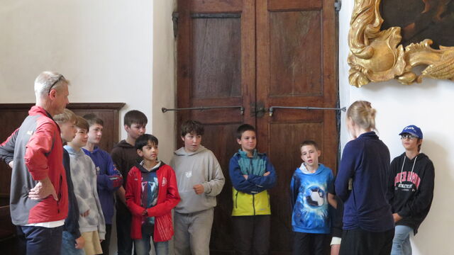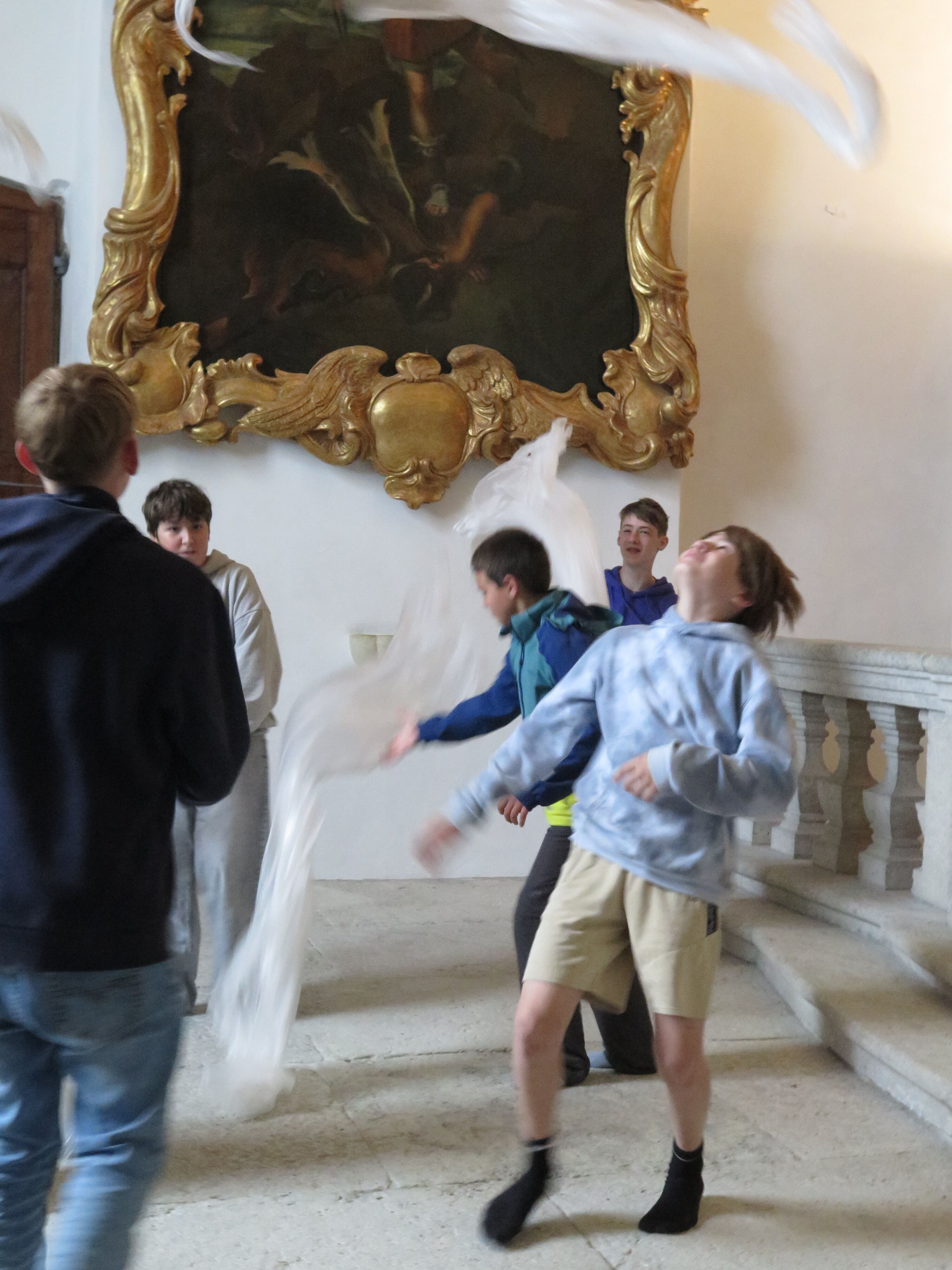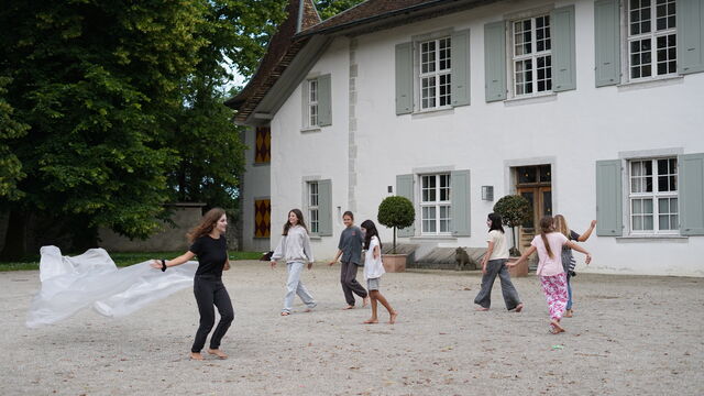 Material und Körper. So lautete das Thema des heutigen Ateliers «Figurentheater» für eine Schulklasse. Dieses fand in der Kapelle des Schloss Waldeggs statt und wurde geleitet durch Mirjam Ellenbroek. Zu Beginn wurde ein Kreis gebildet. Mit einer umhergehenden Klatschbewegung durfte sich jeder kurz mit seinem Namen vorstellen. Danach folgte eine Lockerungsübung. Anschliessend fanden sich alle in einem Sitzkreis ein. Nach einer kurzen Dehneinheit begann das eigentliche Programm. Zu langsamer Klaviermusik begann sich jeder für sich zu bewegen.