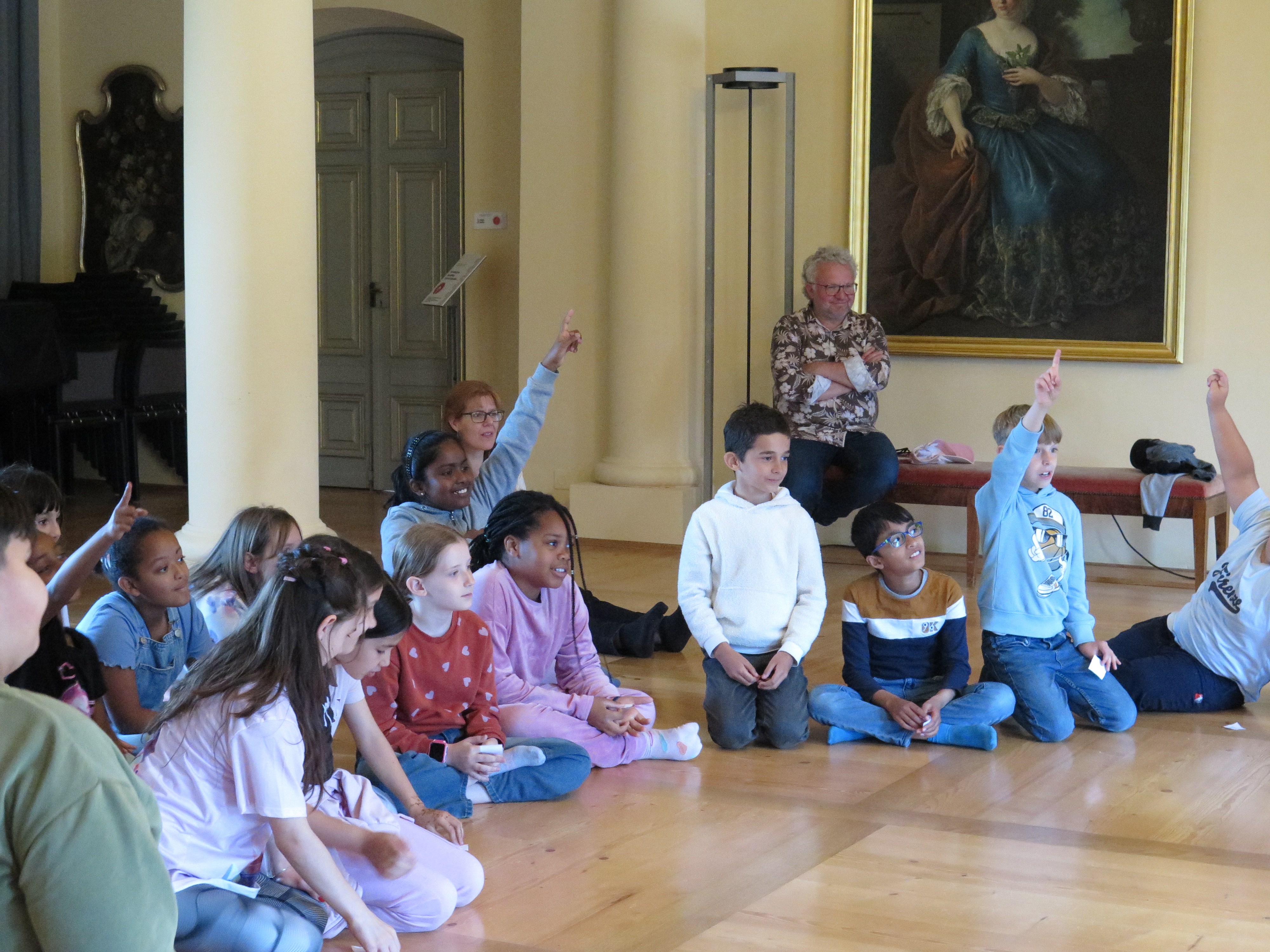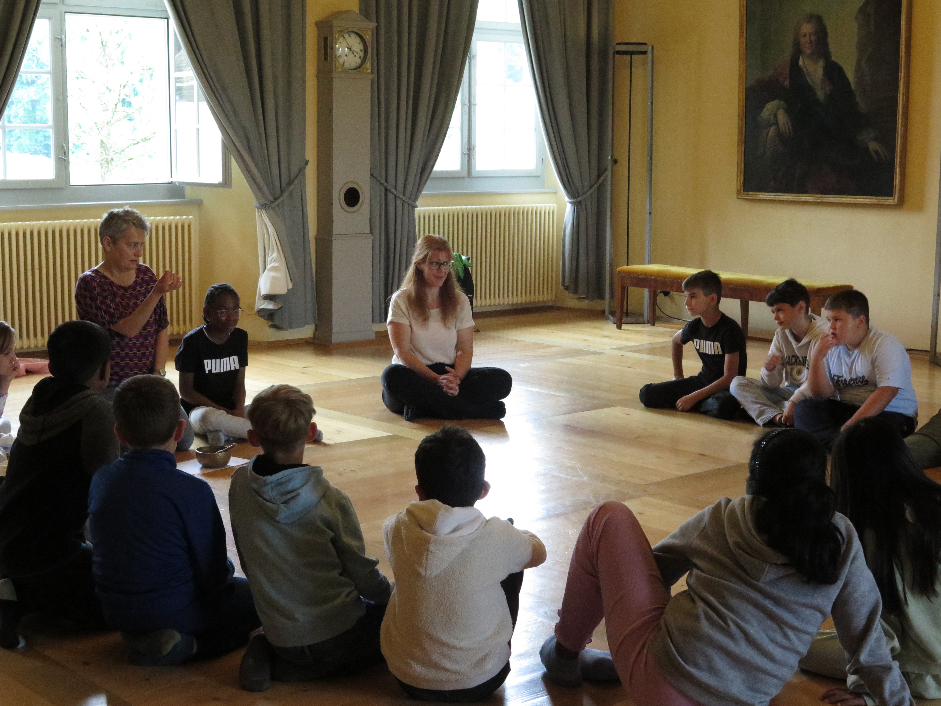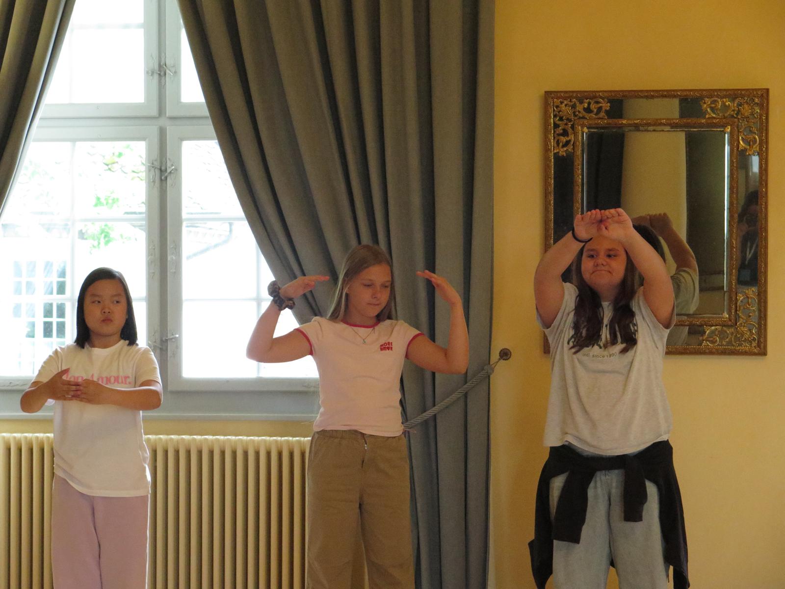 Der Workshop «Pantomime» fand im Schlossgebäude im ersten Stock, im Theatersaal statt. Zuerst sollten die Kinder Zweiergruppen bilden und einander nachahmen, als wäre einer der Spiegel und der andere stünde vor dem Spiegel. Mit viel Freude probierten die Kinder das aus und versuchten ihre «Spiegel» irrezuführen. Die Leiterin Tabea Wullimann erklärte noch kurz, wie man Gegenstände am besten darstellt, wenn sie nicht existieren und sie zeigte das am Beispiel einer Tasse. Man sollte nämlich die Bewegungen möglichst langsam und genau durchführen, damit es möglich realistisch aussieht und das Publikum überzeugt.