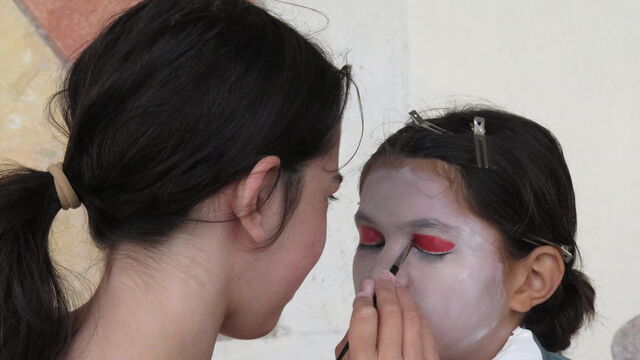 Nun können sie loslegen. Die Kinder sitzen in kleinen Gruppen zusammen und schminken sich gegenseitig. Sie haben Spass daran und sind gespannt, wie das Endresultat aussehen wird. Einige malen Blut, Narben, Augenringe und Vampirzähne auf ihre Gesichter, andere haben sich aber für Blumen entschieden. Ihre Haare werden gebunden und schon können sie anfangen.