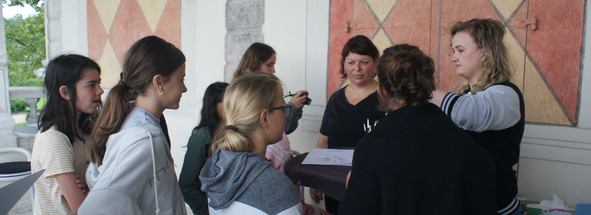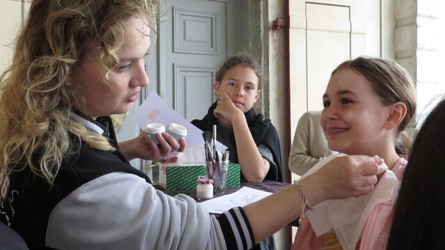 Freitagmorgen: Sieben Mädchen kommen auf dem Balkon des Schlosses, um sich bei diesem Atelier als Monster schminken zu lassen. Das von ihnen ausgewählte Thema ist «gruselige Monster».