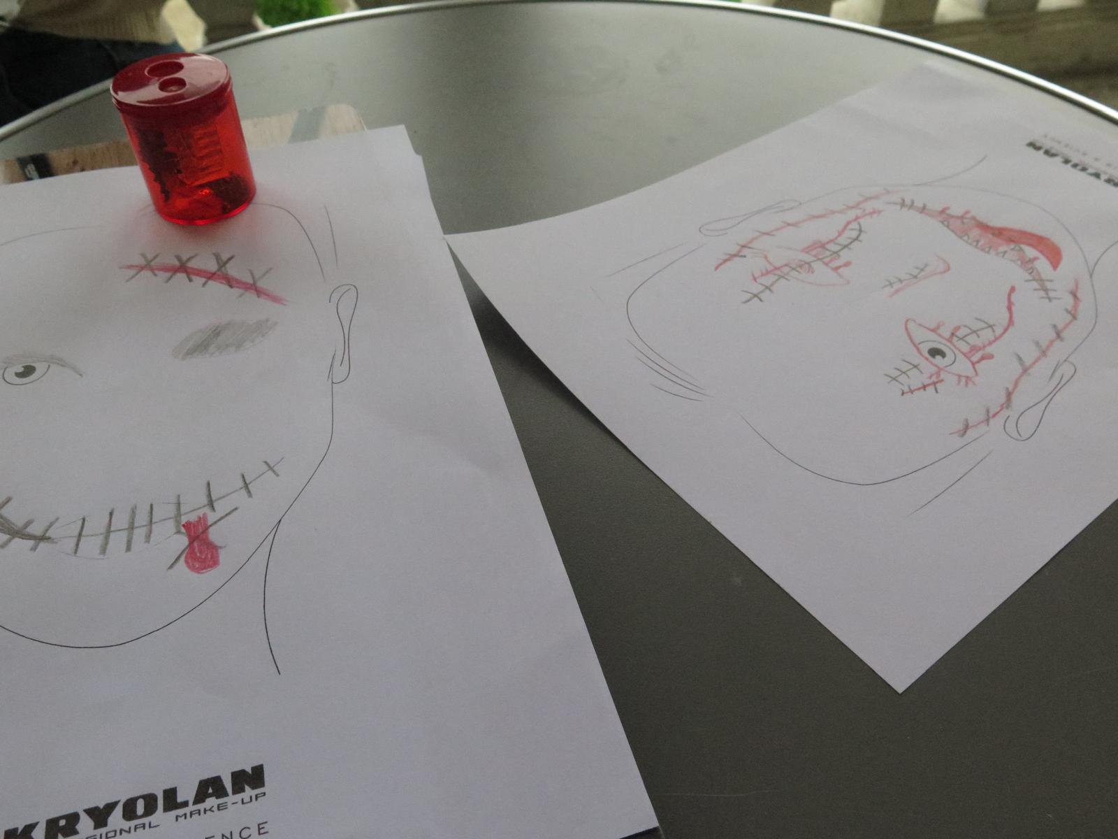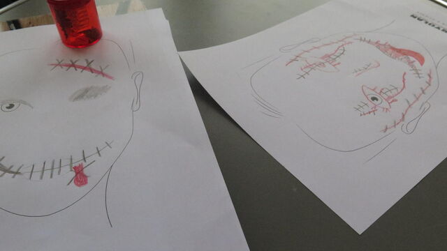 Zu Beginn können sie Skizzen auf Papier entwerfen, so wie sie möchten, dass das fertige Make-Up etwa aussieht. Sie sind sehr kreativ und haben sehr viele Ideen. Die Mädchen lassen ihrer Fantasie freien Lauf und lassen sich von verschiedenen Figuren inspirieren, wie zum Beispiel von den Filmen ES, Grinch und Coco. «So ein blaues Auge möchte ich machen», ruft ein Mädchen. «Meine Mutter würde einen Herzinfarkt kriegen, wenn sie sehen würde, was wir machen», sagt ein anderes Mädchen und lacht dabei.