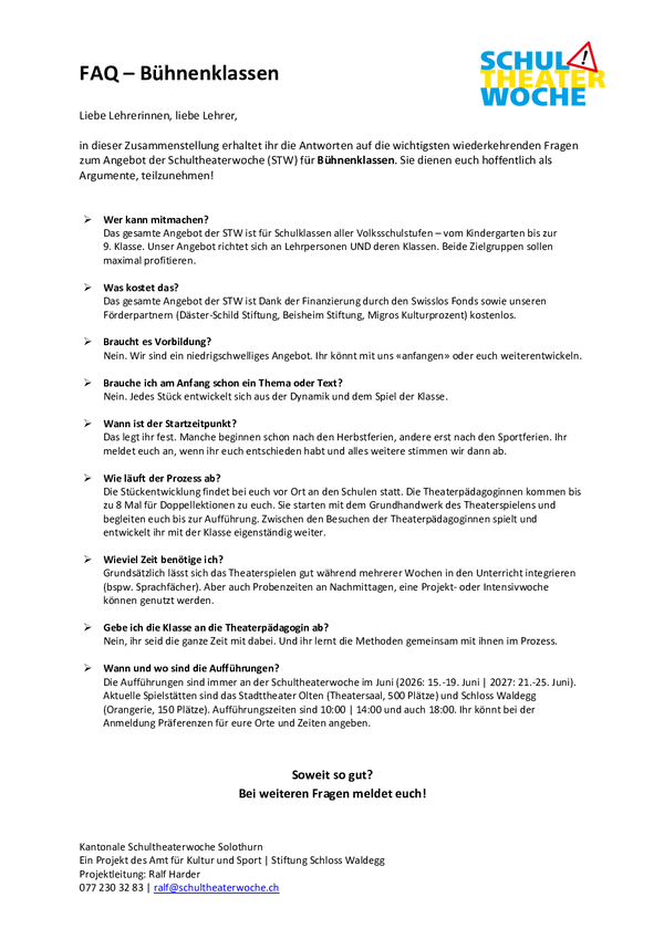 Was erstmal gross klingt, wird mit unseren Theaterpädagoginnen «spielend» möglich. Wir begleiten euch und eure Klassen – ob Kindergarten oder Oberstufe – während mehrerer Wochen bis zu diesem einmaligen Ziel.