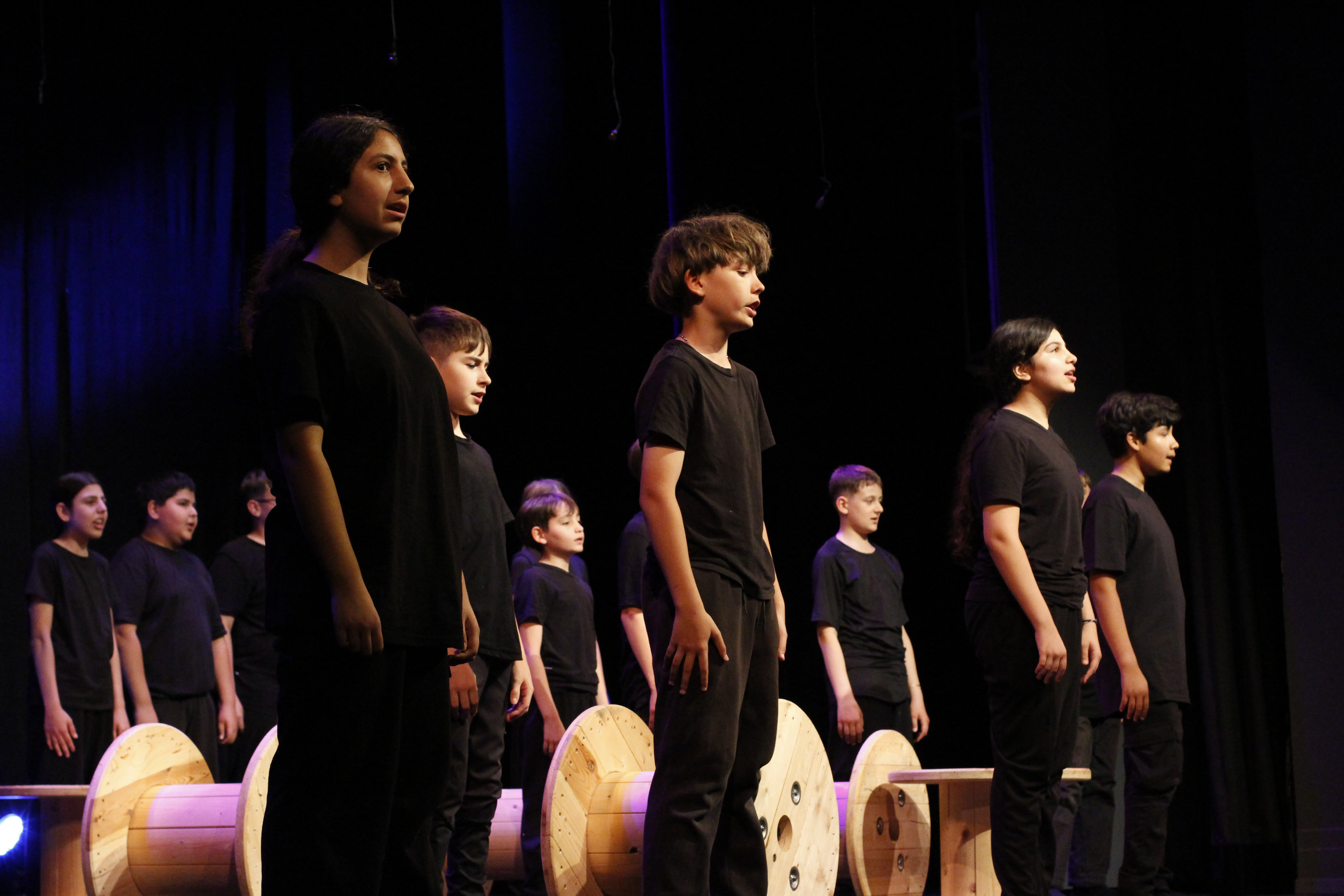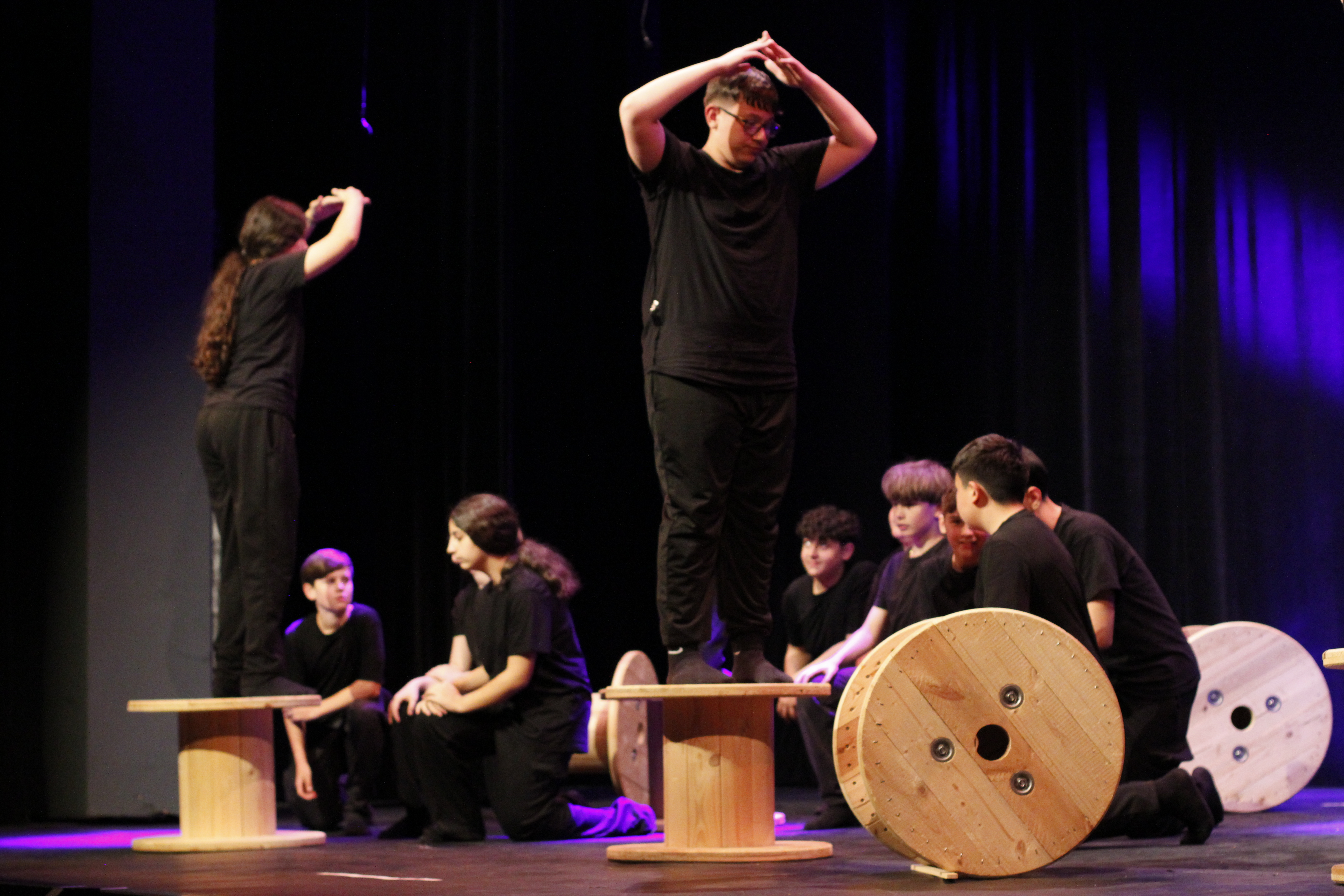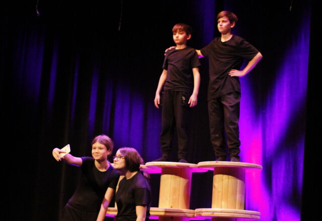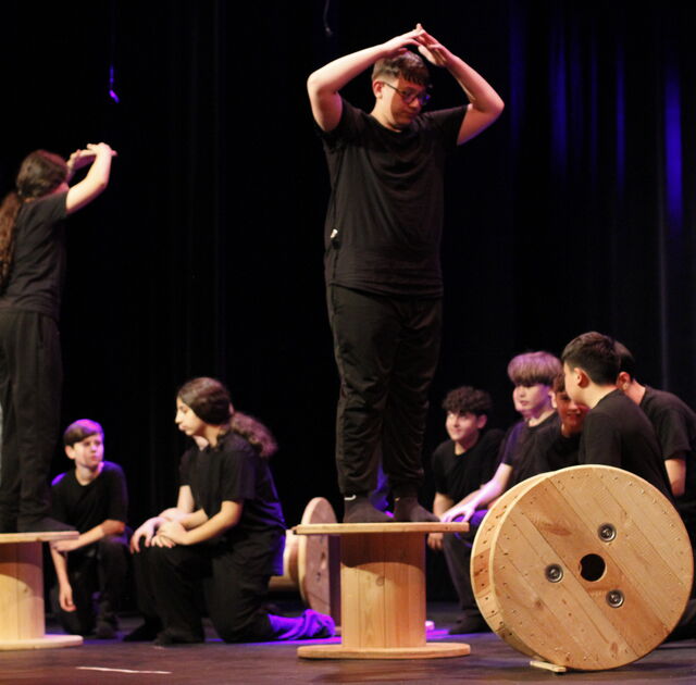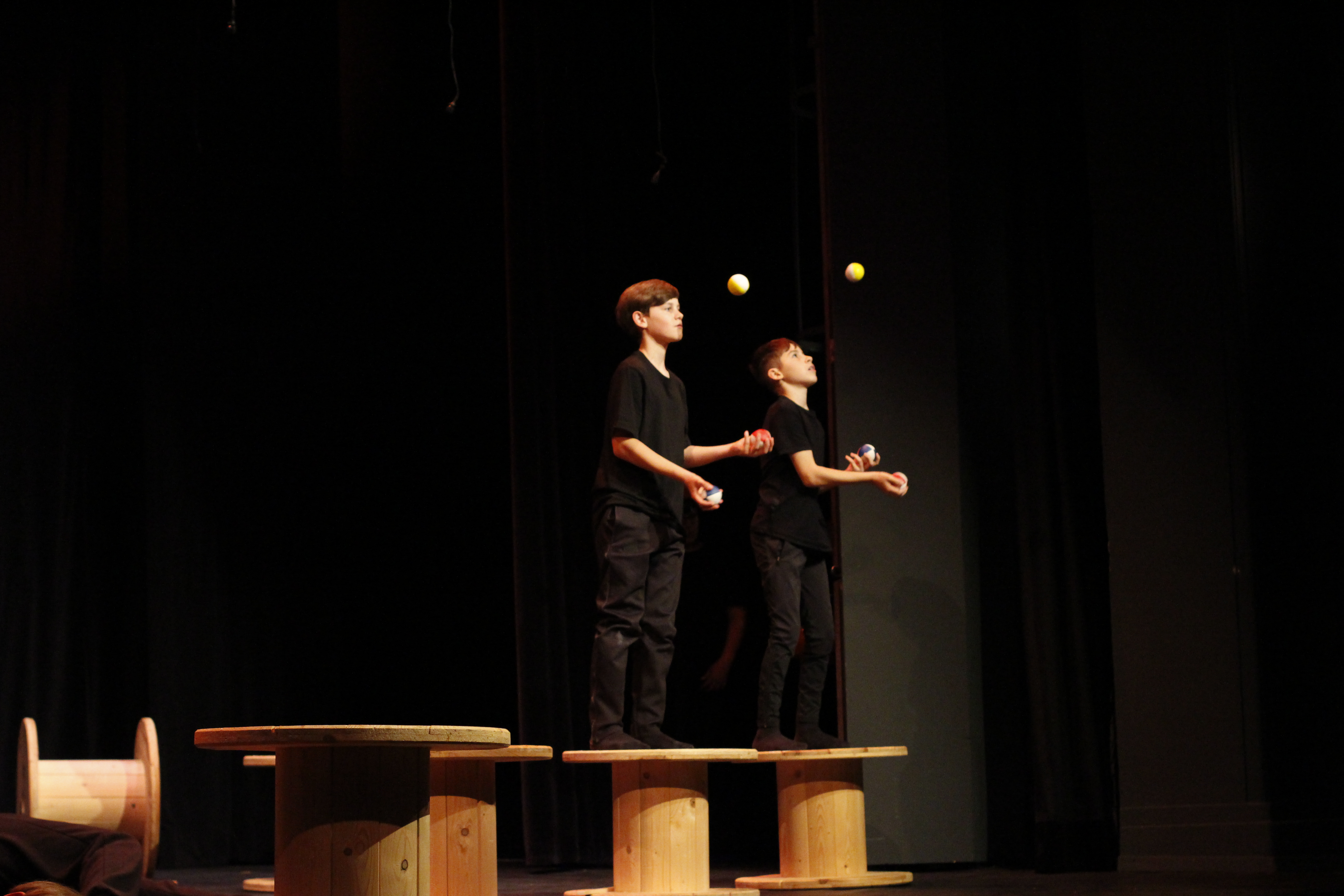 Im Stadttheater hat die Klasse dem Publikum eine Zusammenstellung von Szenen vorgeführt, in denen sie erforschen, was diese Kabeltrommeln alles sein könnten. Eine Baustelle mit Bauarbeitern und kräftigen Bauarbeiterinnen, Kraftgeräte, um vor den Frauen anzugeben, mehrere Automechaniker, die danach ein Rennen fuhren, ein Denkmal, Diebstahl, eine Achterbahn mit Übelkeit und Zuckerwatte, ein Drehrad auf dem Spielplatz, Artisten, Tische und vieles mehr. Es war eine unglaubliche Vielfalt auf der Bühne zu sehen. Diese Vielfalt zeigt sich auch beim Nachgespräch.