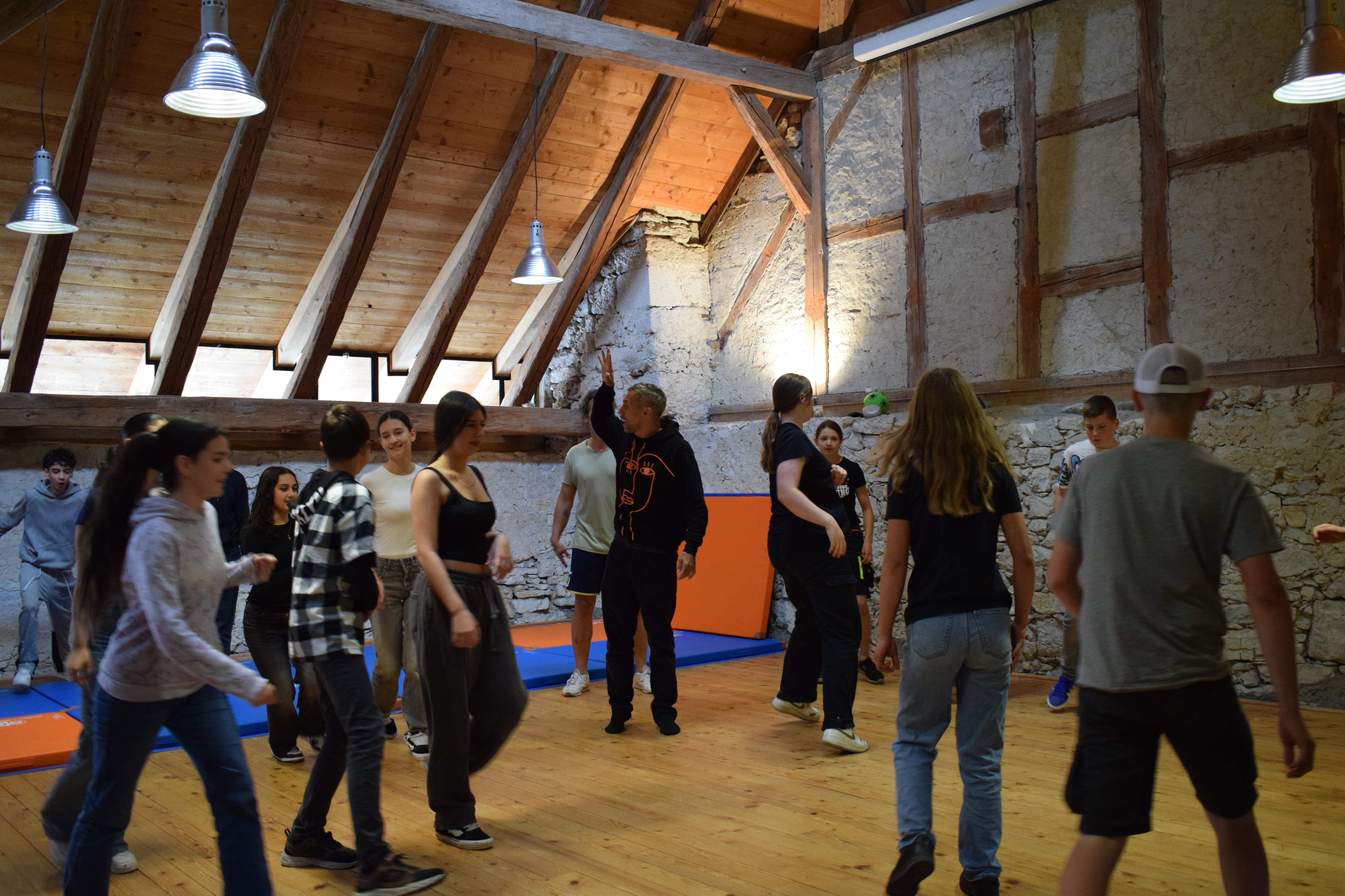 Ein Schlag zischt durch die Luft. Jemand geht zu Boden. Und dann – lautes Lachen. Im Bühnenkampf-Atelier wird nicht gestritten, sondern Theater gespielt. Auf Schloss Waldegg erleben Klassen, wie spannend ein gespielter Kampf auf der Bühne sein kann.